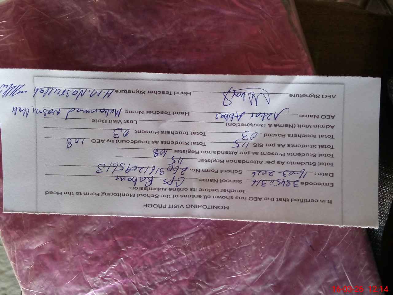 | Certified that this School was Inspected by the Undersigned MEA/DMO Today and the Information Stated Above is as Per Record. | |||||
