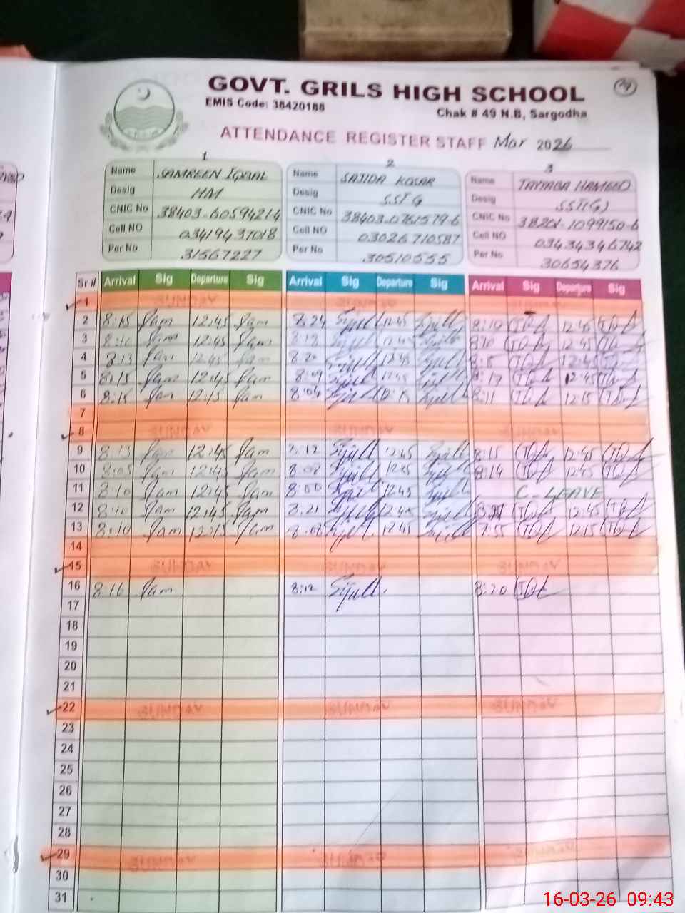| CNIC | Full Name | Designation | R/C | Absence during last cal. month |
