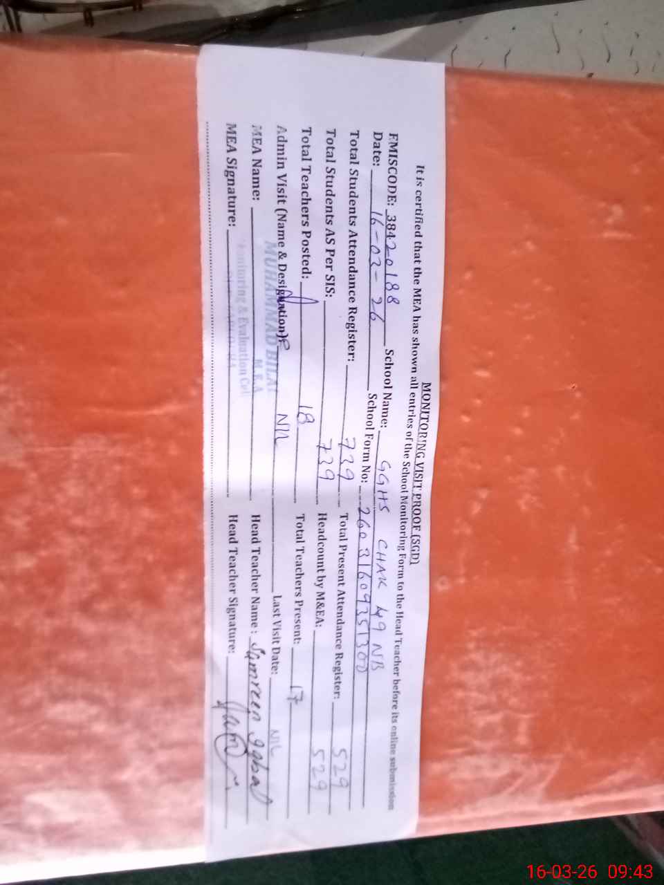 | Attendance Register | Head Teacher | MEA with School | Visit Proof |