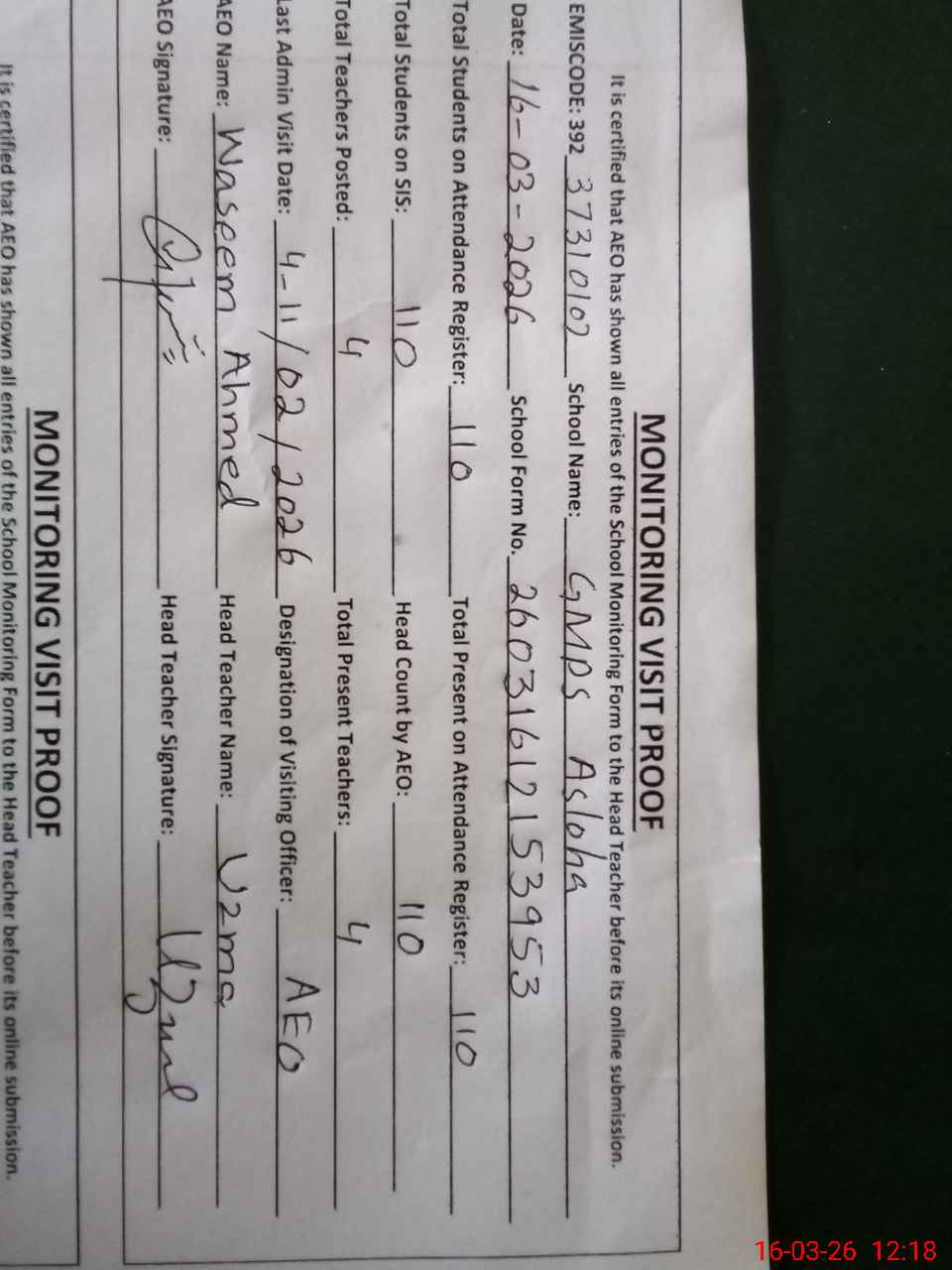 | Name: Uz**** Designation: (School Headmaster's/Headmistress's) PST Phone/Cell Number: 03**** |