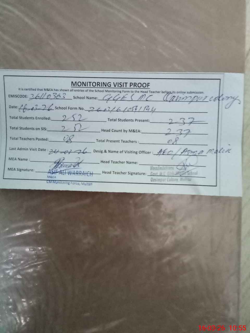 | Certified that this School was Inspected by the Undersigned MEA/DMO Today and the Information Stated Above is as Per Record. | |||||
