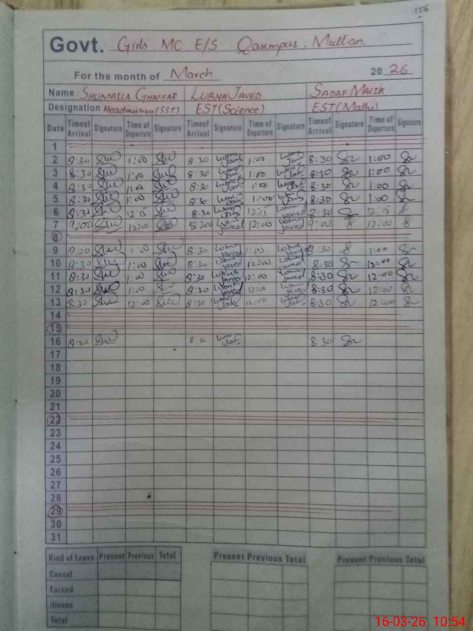 | Leave | Duty | Absent | Maternity | Medical | Ex- Pak |