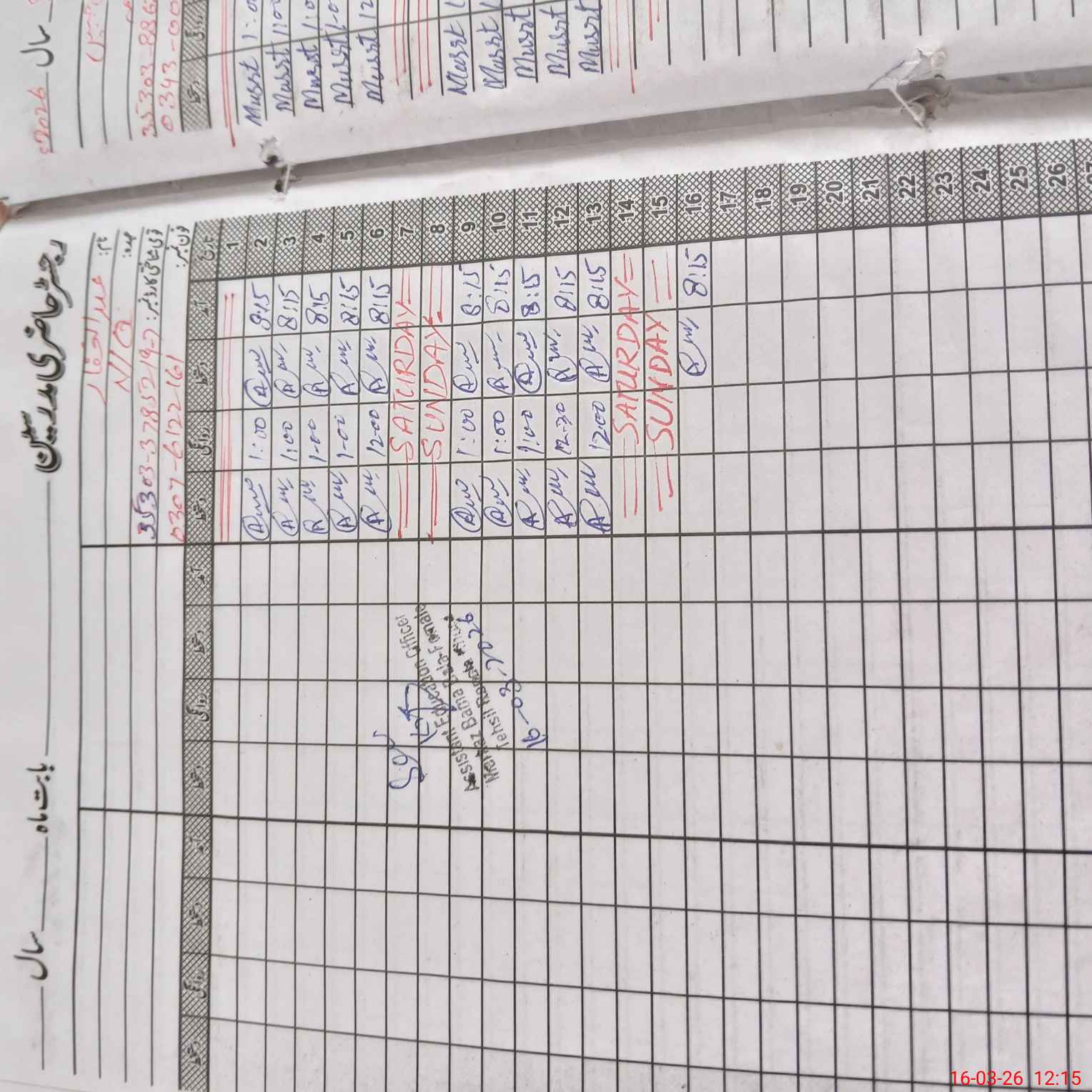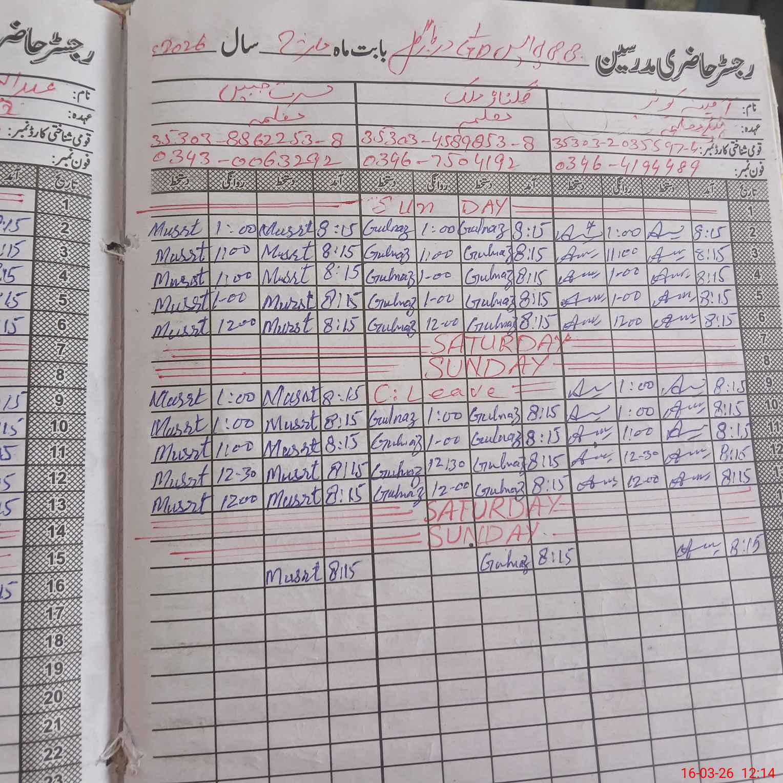 | CNIC | Full Name | Designation | R/C | Absence During Last Calender Month |