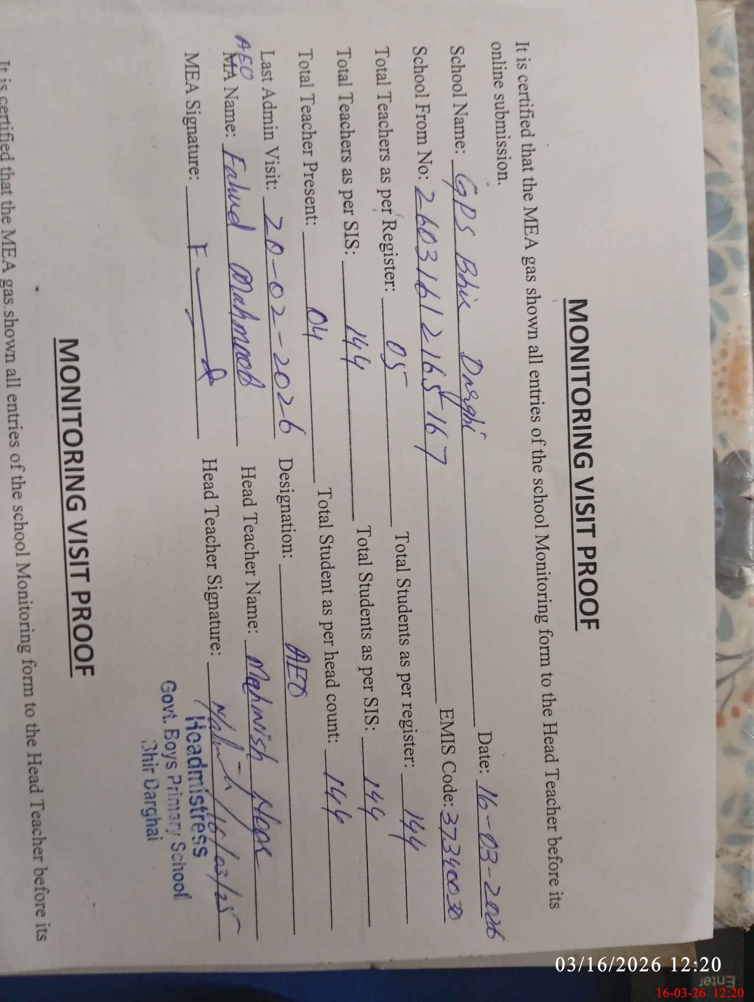 | EMIS Code: 37340030 | Name of School: GPS BHIRDAR GAHI | |||