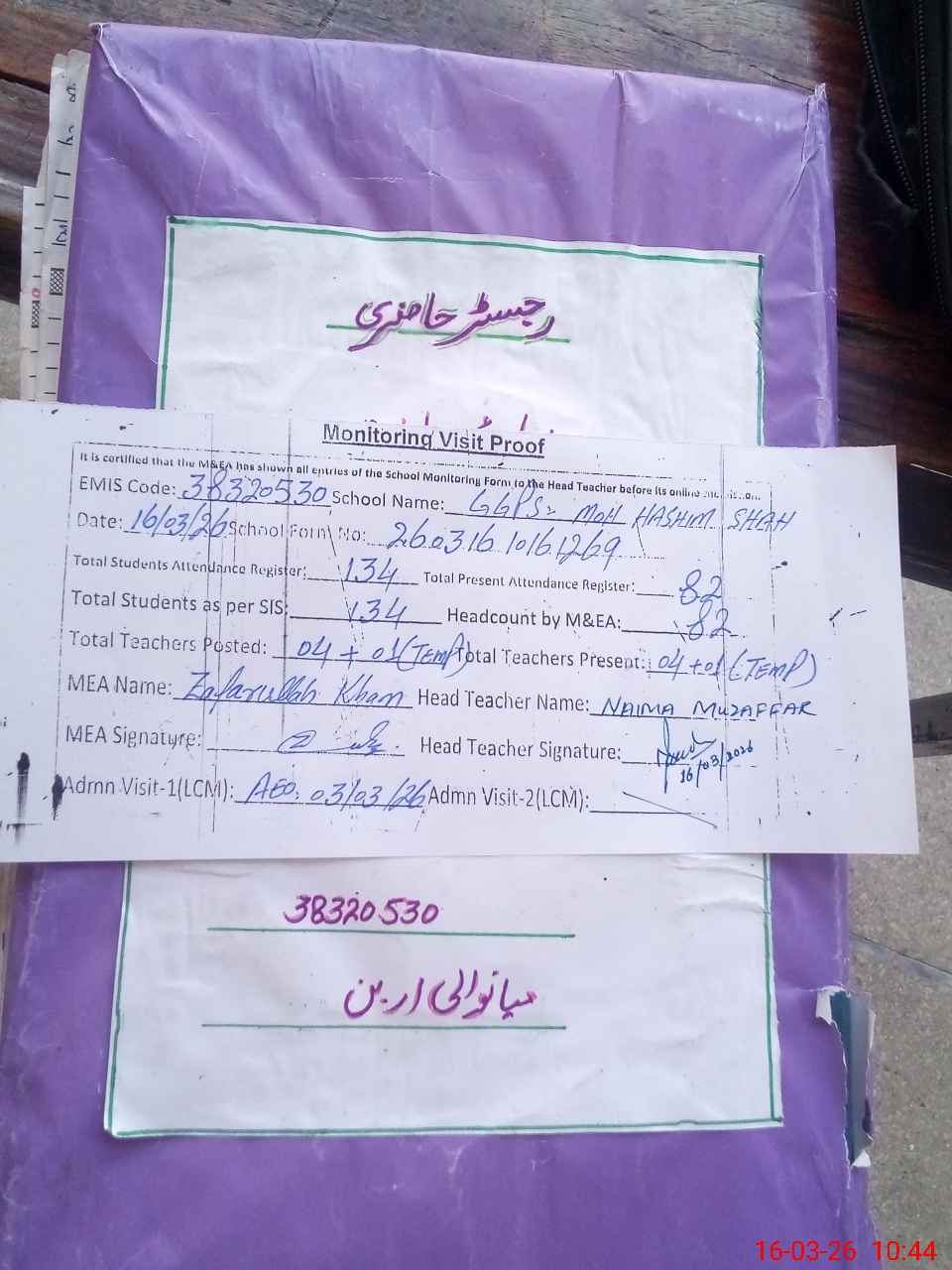 | Attendance Register | Head Teacher | MEA with School | Visit Proof |