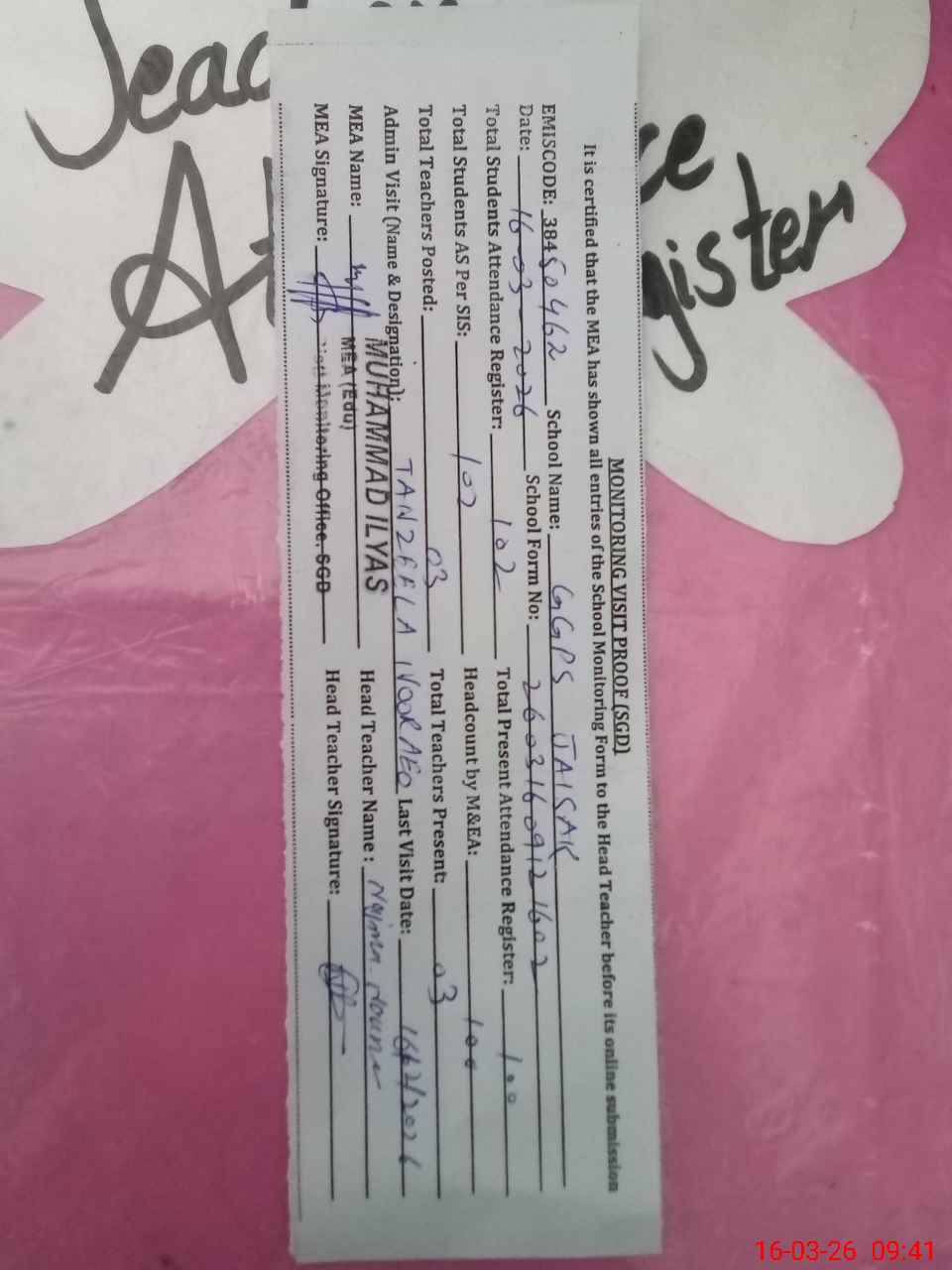 | Attendance Register | Head Teacher | MEA with School | Visit Proof |