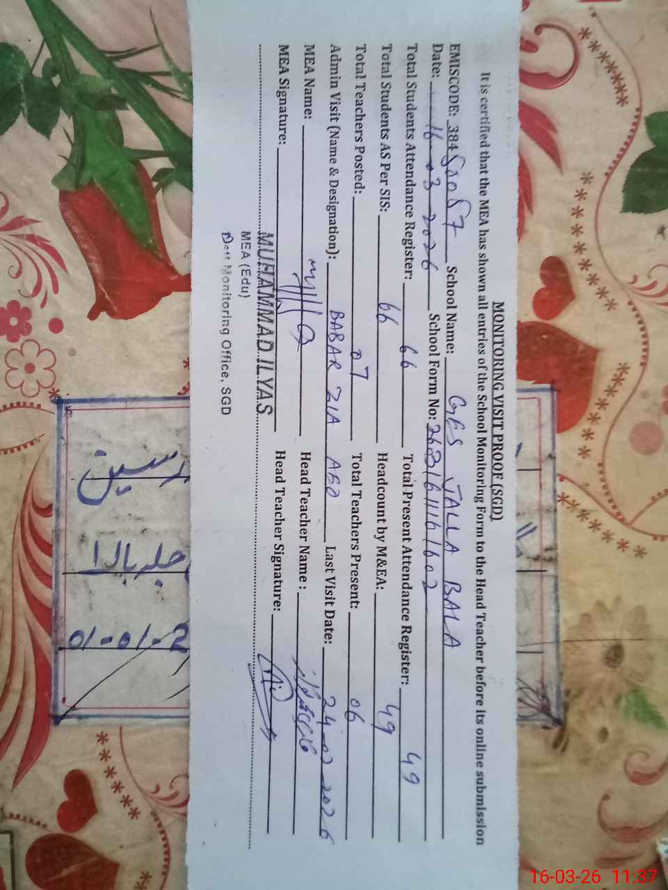 | Certified that this School was Inspected by the Undersigned MEA/DMO Today and the Information Stated Above is as Per Record. | |||||