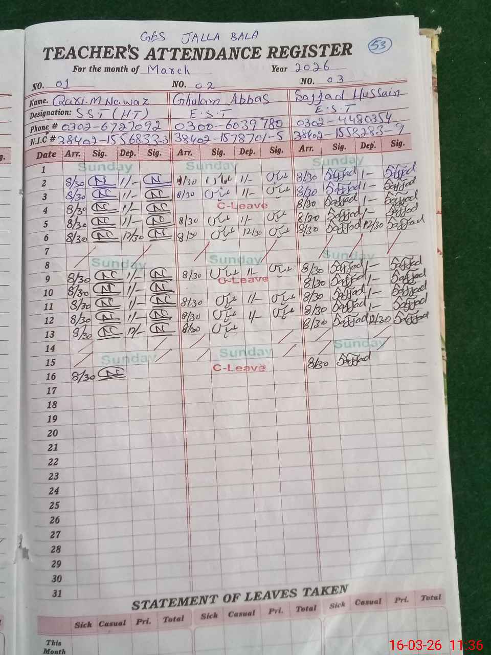 | 38**** | MU**** HA**** | CHOWKIDAR | Contract | 3 | 0 | 0 | 0 | 0 | 0 | 0 | 0 | 3 | Casual |