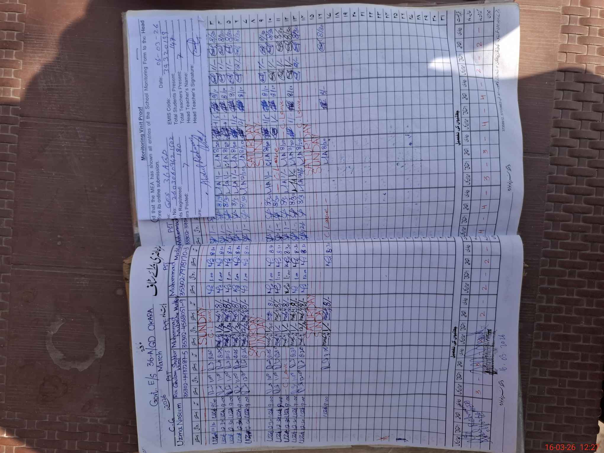 | Attendance Register | Head Teacher | MEA with School | Visit Proof |