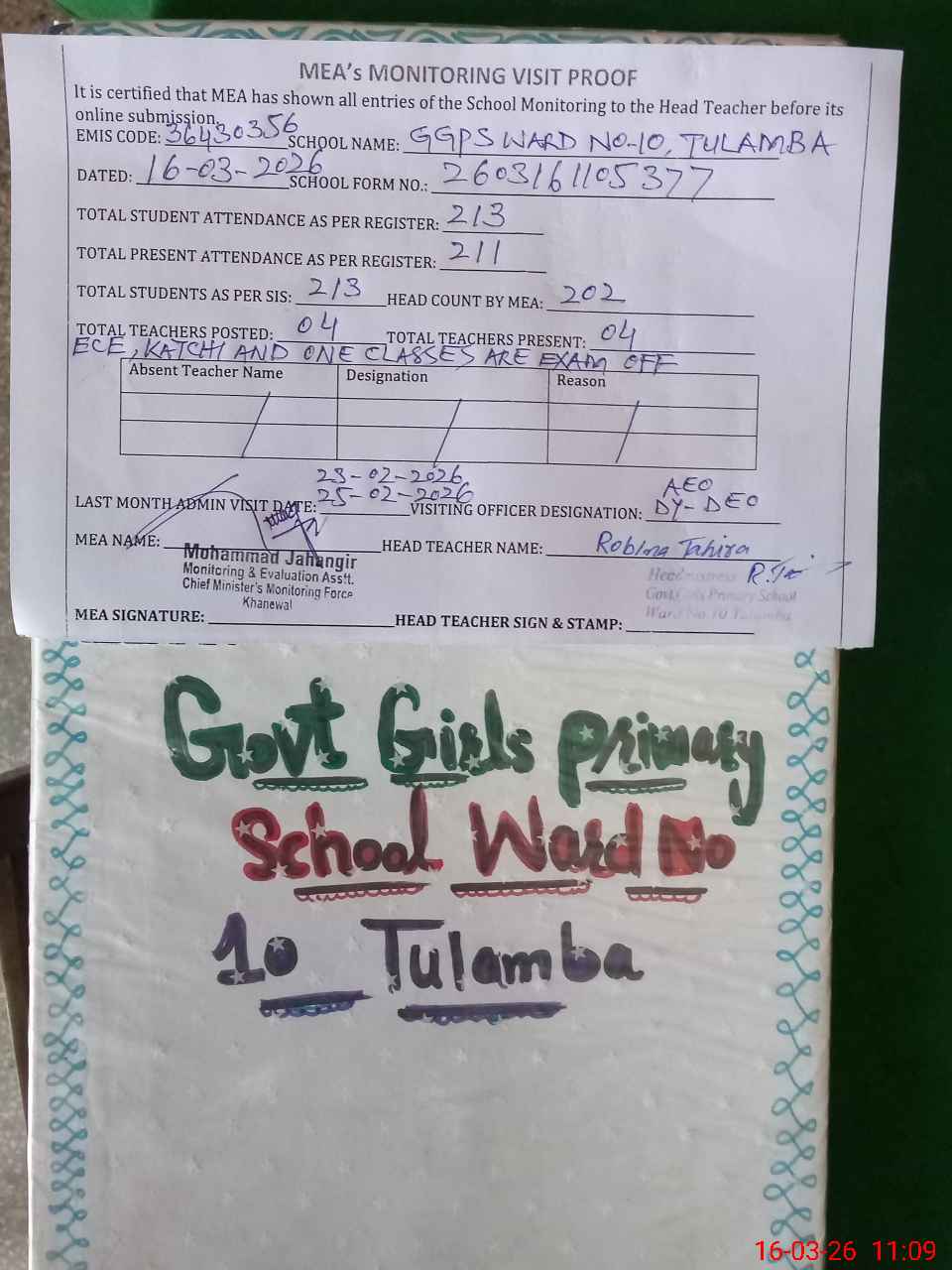 | District: KHANEWAL | Tehsil: MIAN CHANNU | Markaz: TULAMBA-IV - FEMALE | Level: Primary | |