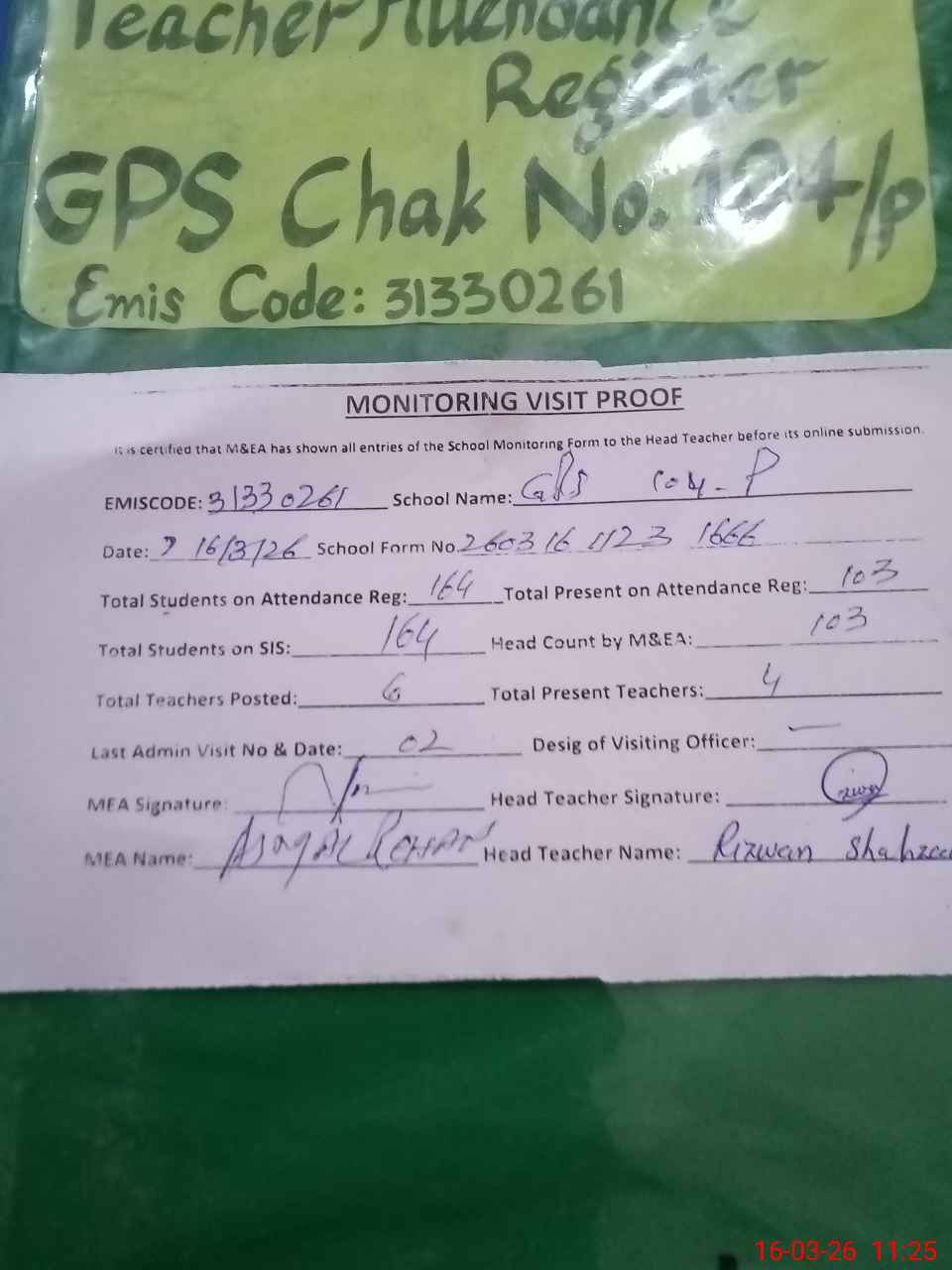 | EMIS Code: 31330261 | Name of School: GPS CHAK NO. 104/P | |||