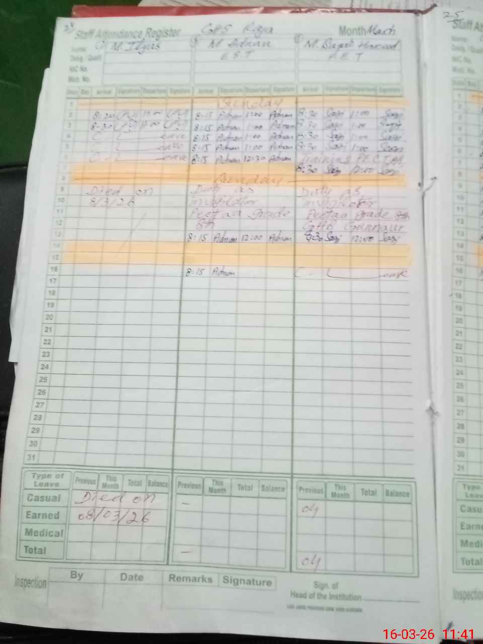 | CNIC | Full Name | Designation | R/C | Absence During Last Calender Month |