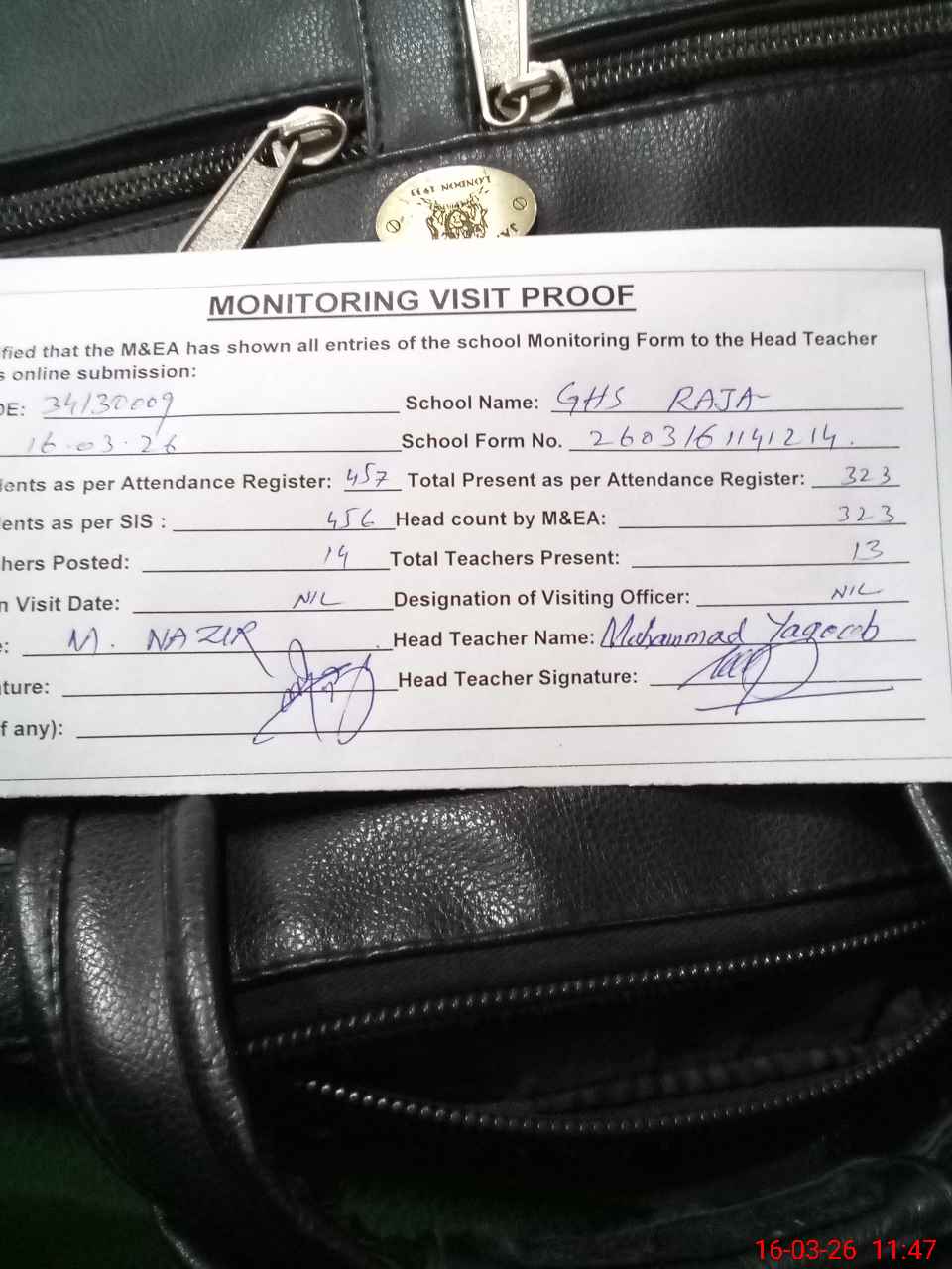 | Attendance Register | Head Teacher | MEA with School | Visit Proof |