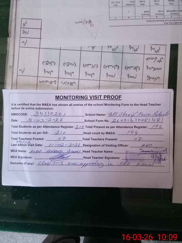 | EMIS Code: 34110241 | Name of School: GPS SHARIF FARM RAHWALI | |||