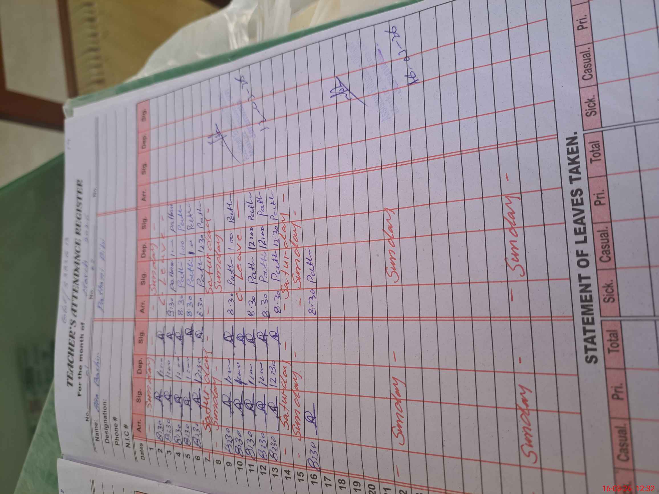 | CNIC | Full Name | Designation | R/C | Absence During Last Calender Month |