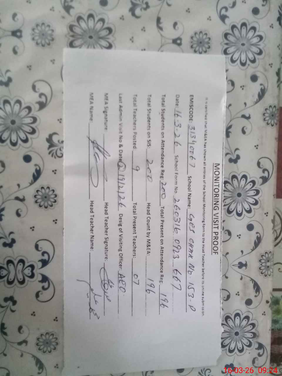 | Attendance Register | Head Teacher | MEA with School | Visit Proof |
