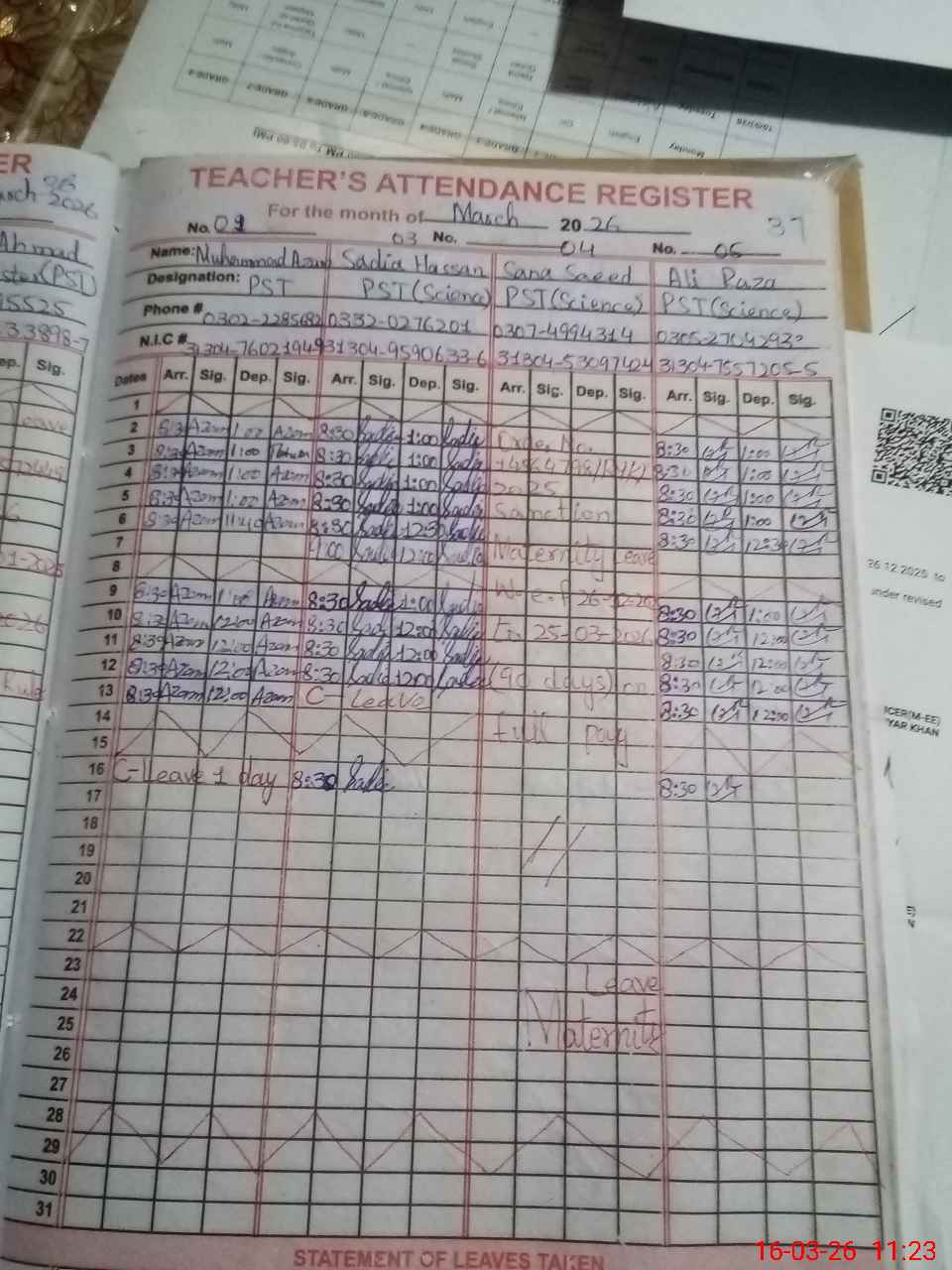 | CNIC | Full Name | Designation | R/C | Absence during last cal. month |