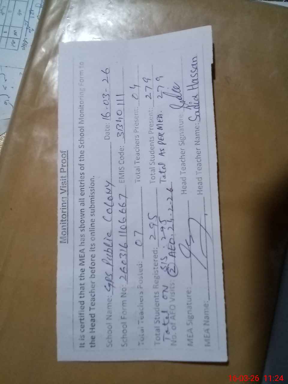 | Attendance Register | Head Teacher | MEA with School | Visit Proof |