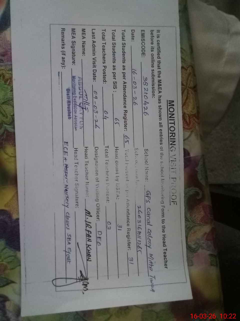 | Name: MU**** IR**** Designation: (School Headmaster's/Headmistress's) PST/PTC/JV Phone/Cell Number: 03**** |