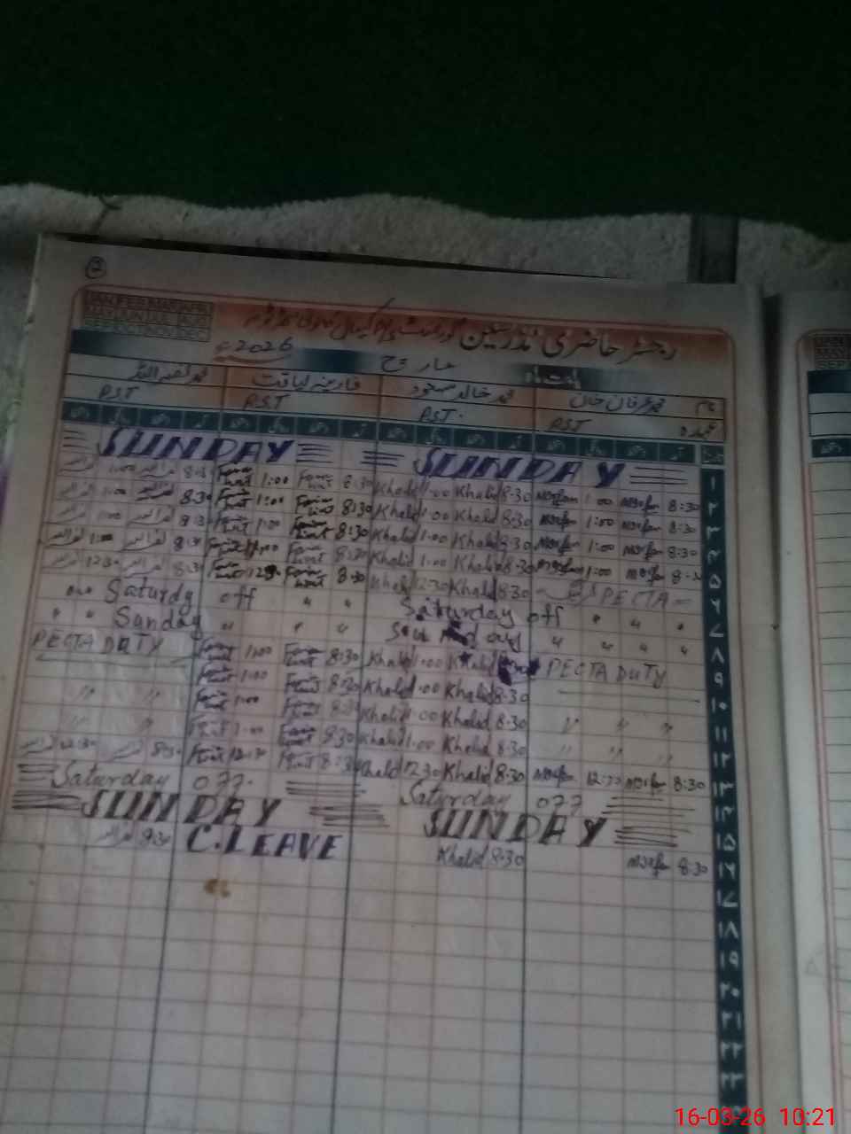 | Leave | Duty | Absent | Maternity | Medical | Ex- Pak |
