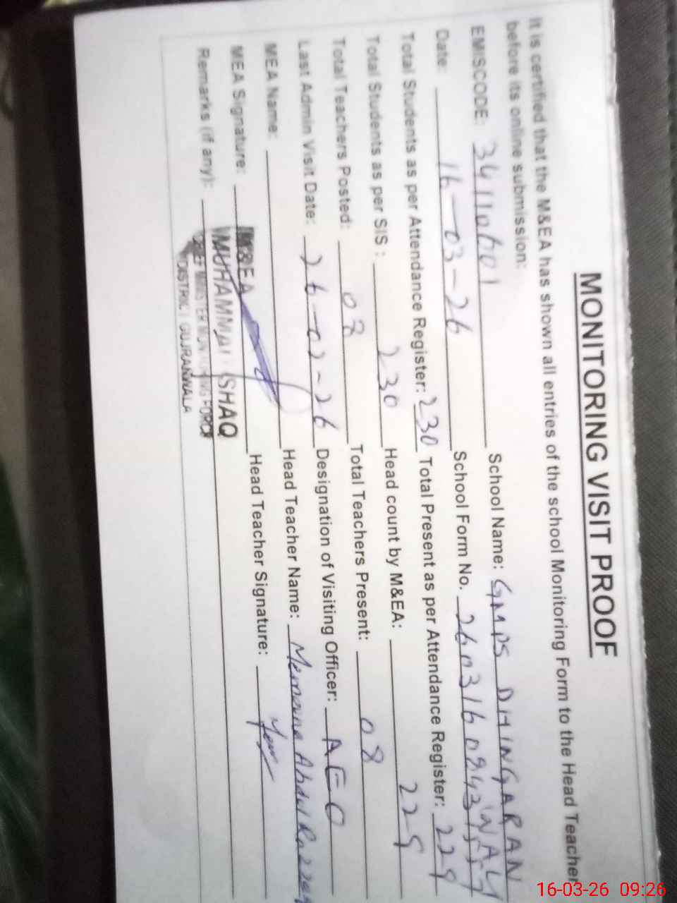 | Attendance Register | Head Teacher | MEA with School | Visit Proof |