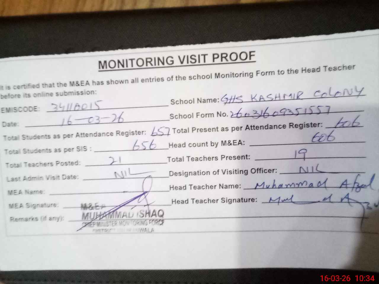 | EMIS Code: 34110015 | Name of School: GHS KASHMIR COLONY GUJRANWALA CANTT | |||