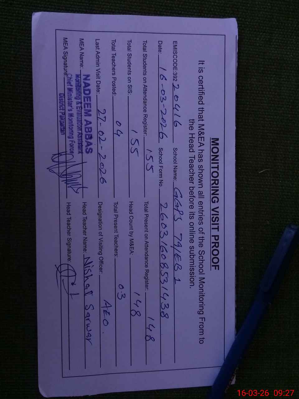 | EMIS Code: 39220416 | Name of School: GGPS 79/EB-I ARIFWALA | |||