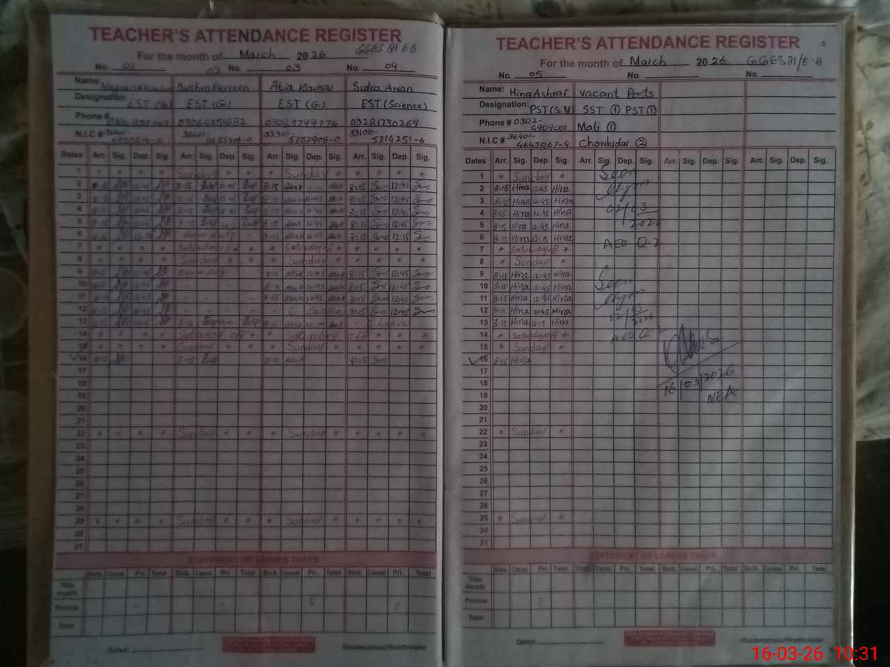 | Name: NA**** KO**** Designation: (School Headmaster's/Headmistress's) EST (GENERAL) Phone/Cell Number: 03**** |