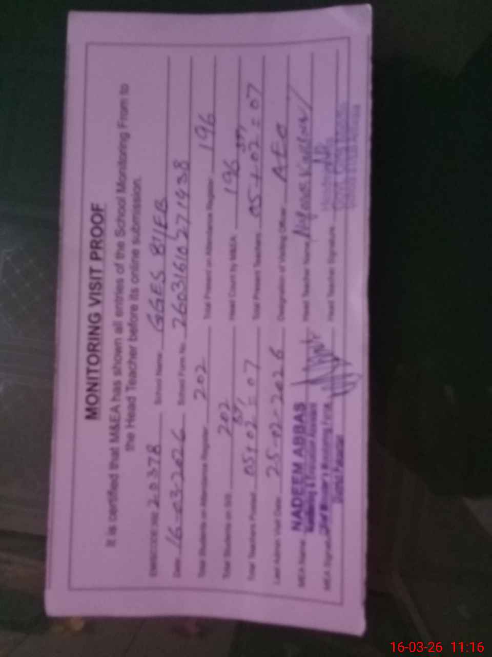 | Attendance Register | Head Teacher | MEA with School | Visit Proof |