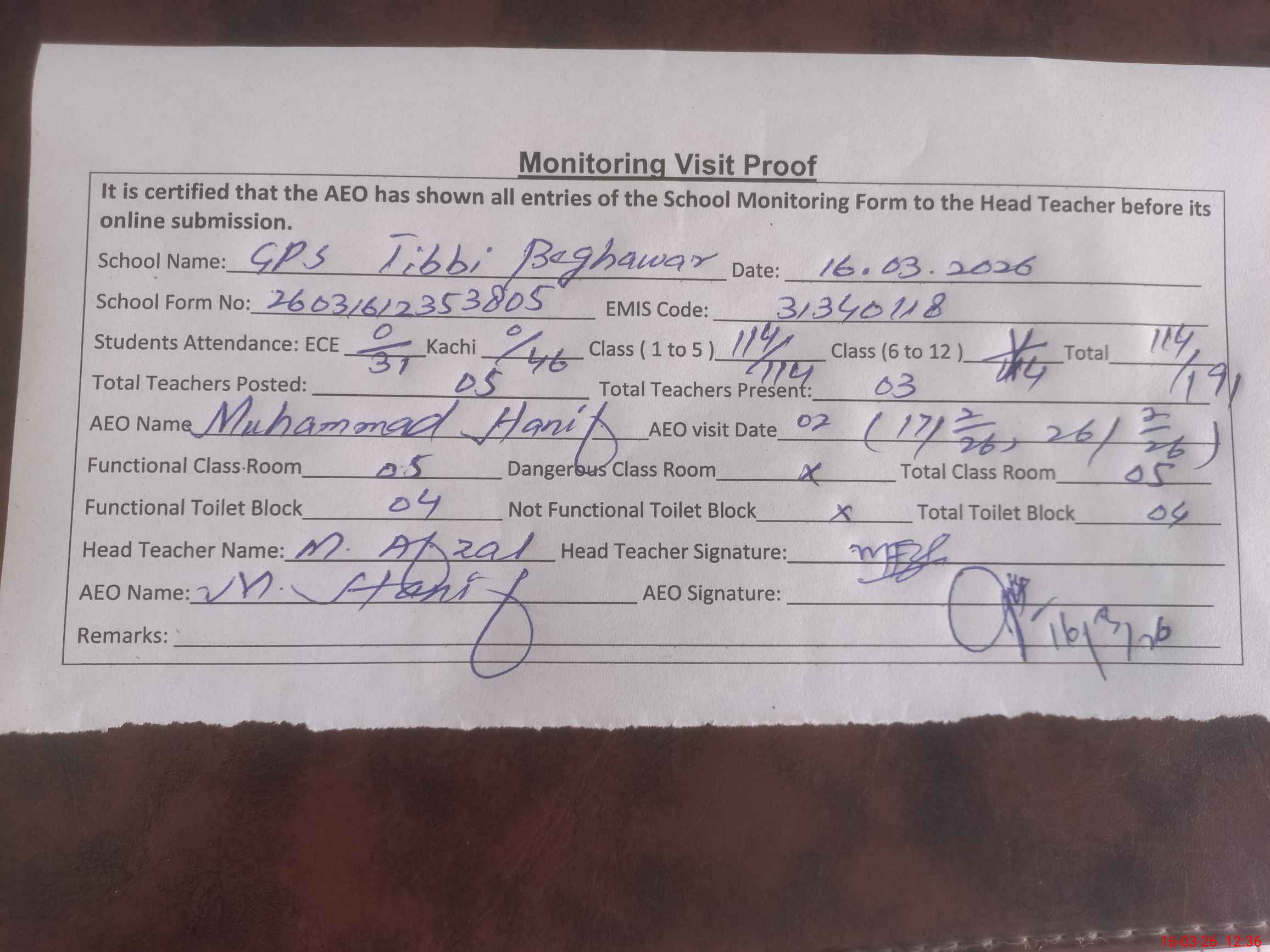 | EMIS Code: 31340118 | Name of School: GPS TIBBI BEGHWER CHAK NO. 168/P | |||