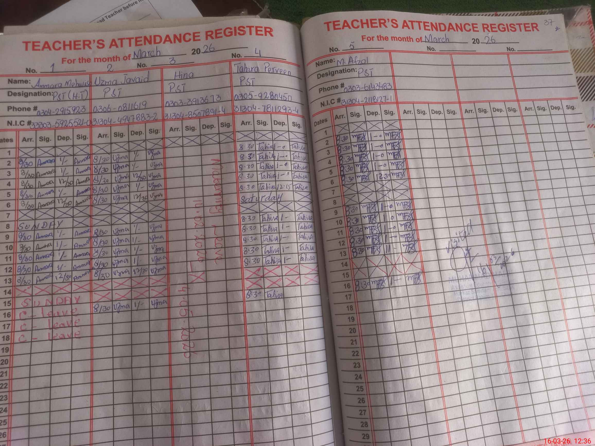 | CNIC | Full Name | Designation | R/C | Absence During Last Calender Month |