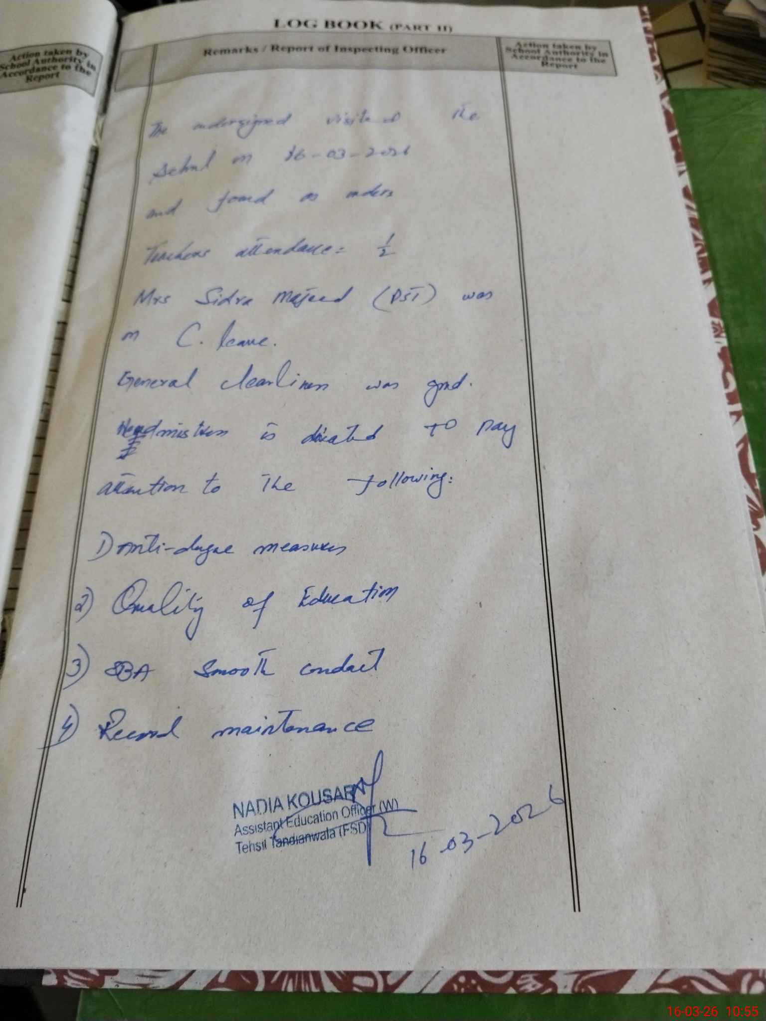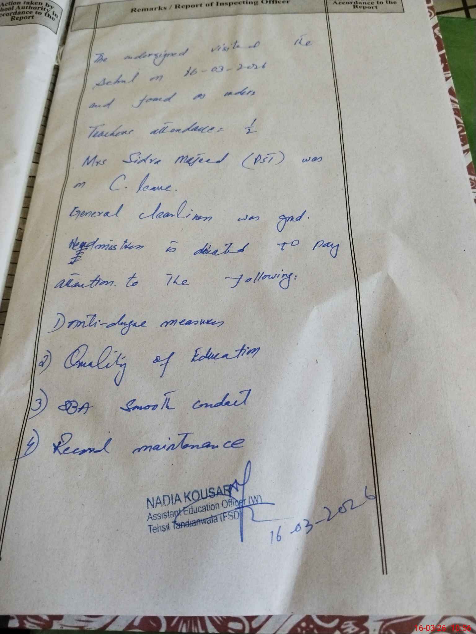 | Certified that this School was Inspected by the Undersigned MEA/DMO Today and the Information Stated Above is as Per Record. | |||||
