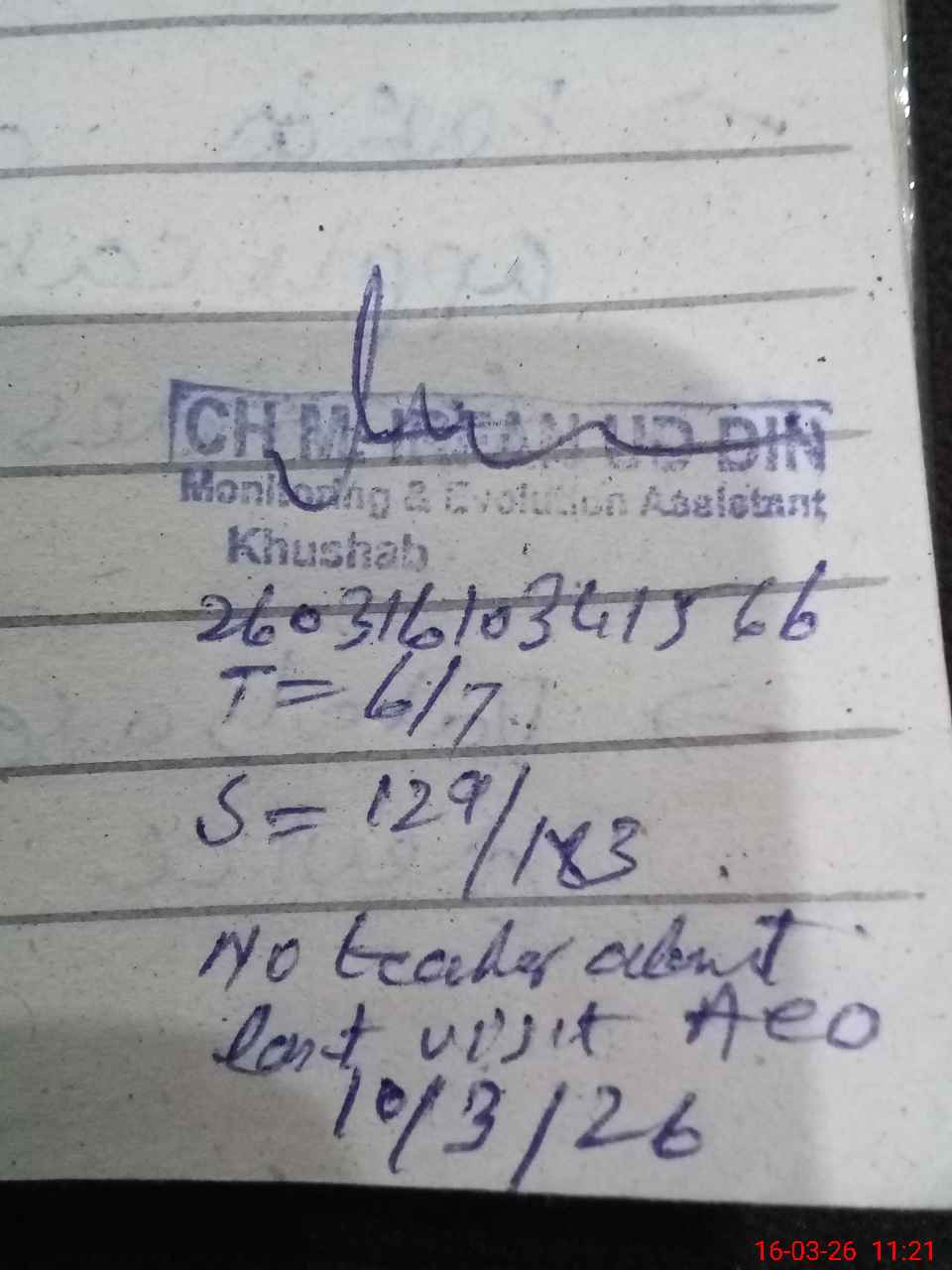| Remarks (Use Separate Page if Required): GES 8 mb student on sis 183 student on register 183. head count 129 no teacher absent one on leave last visit aeo 10/3/26 security guard required washroom needed ece and nursery classes are suspended due to war situation | |||||