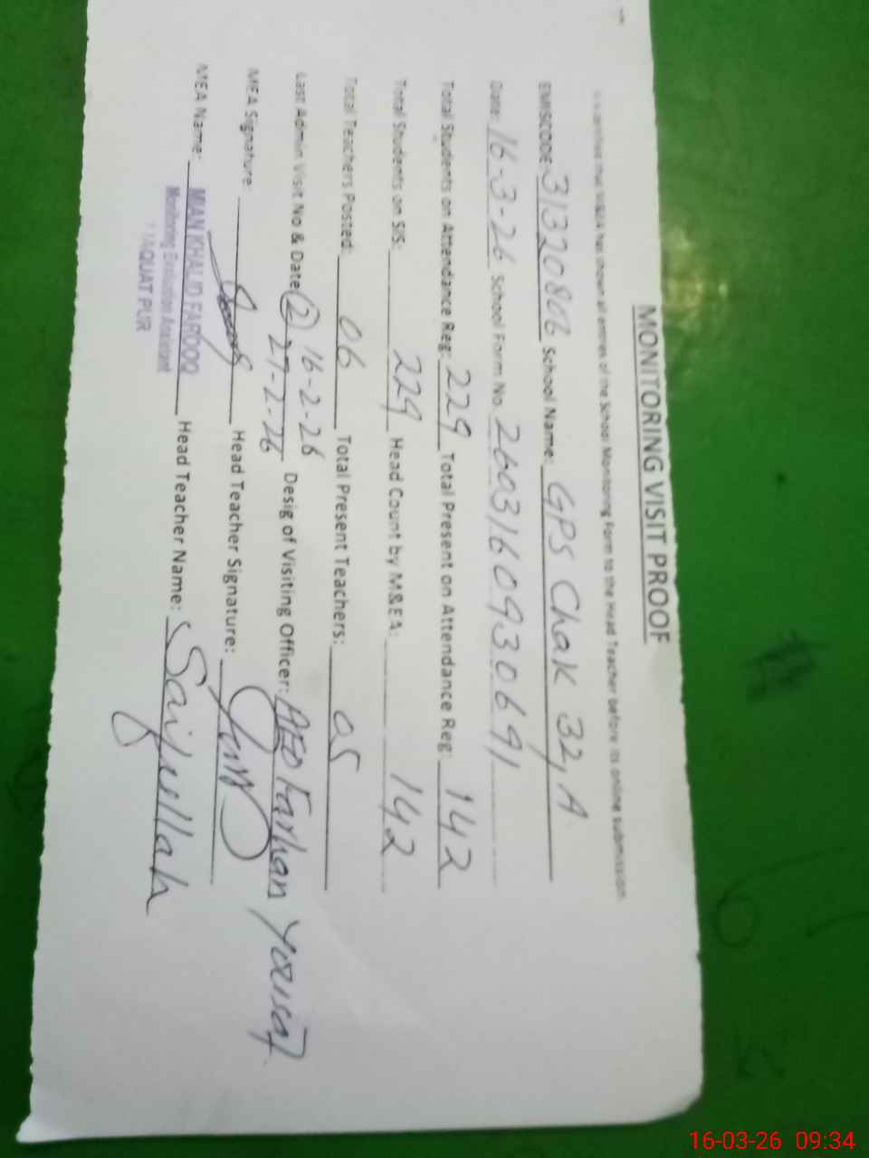 | Attendance Register | Head Teacher | MEA with School | Visit Proof |