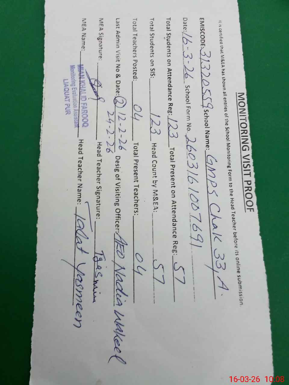 | Attendance Register | Head Teacher | MEA with School | Visit Proof |