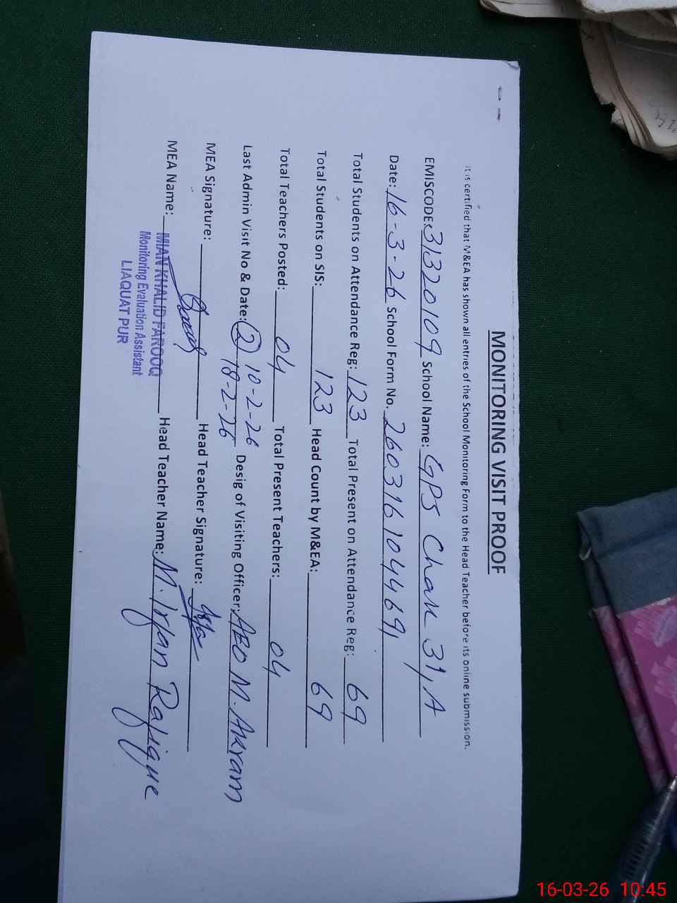 | Attendance Register | Head Teacher | MEA with School | Visit Proof |