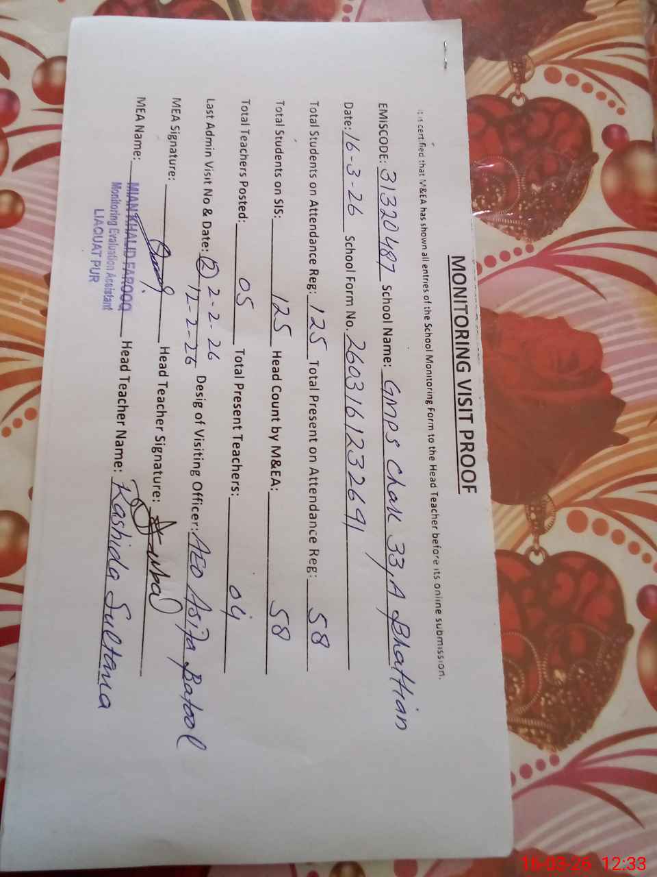 | EMIS Code: 31320487 | Name of School: GMPS CHAK NO. 33/A BHUTTIAN | |||
