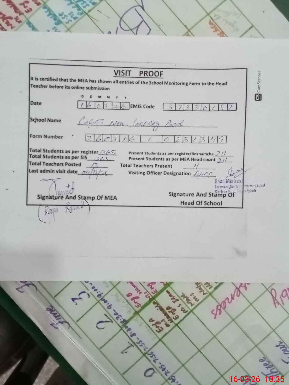 | Remarks (Use Separate Page if Required): ECE and Nur students are not present in school due to paper is finished Nsb record is not updated on sis and pmiu app Almost 100 students of different classes are sitting without furniture | |||||