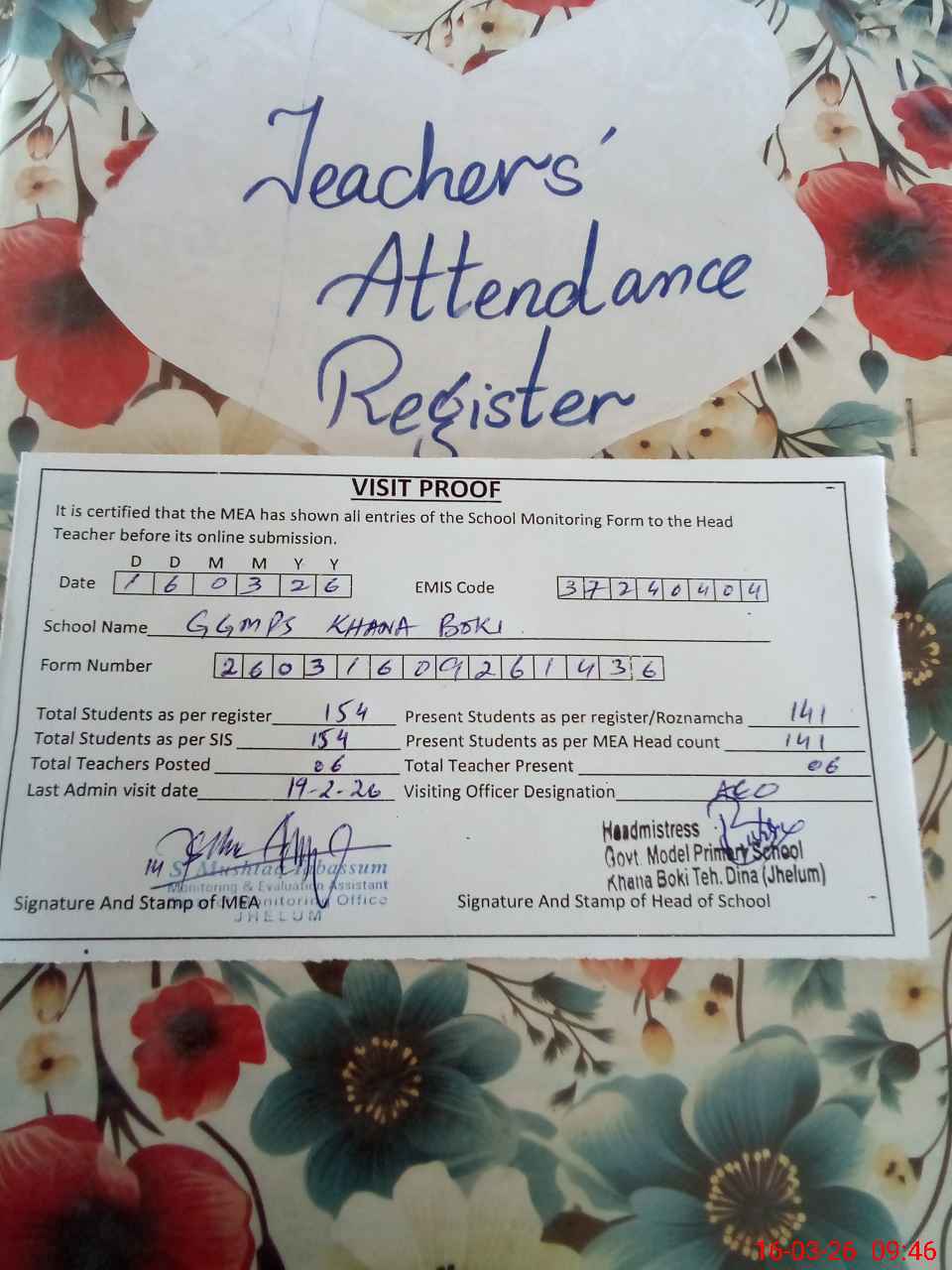 | Attendance Register | Head Teacher | MEA with School | Visit Proof |