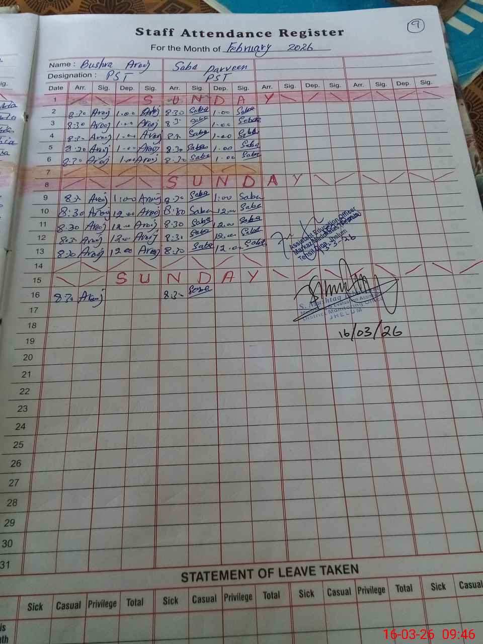 | Monitoring Date: 16-03-2026 | Start Time: 16-03-2026 09:26 AM | End Time: 16-03-2026 09:55 AM | Name of MEA: Sh**** Mu**** Ta**** | |