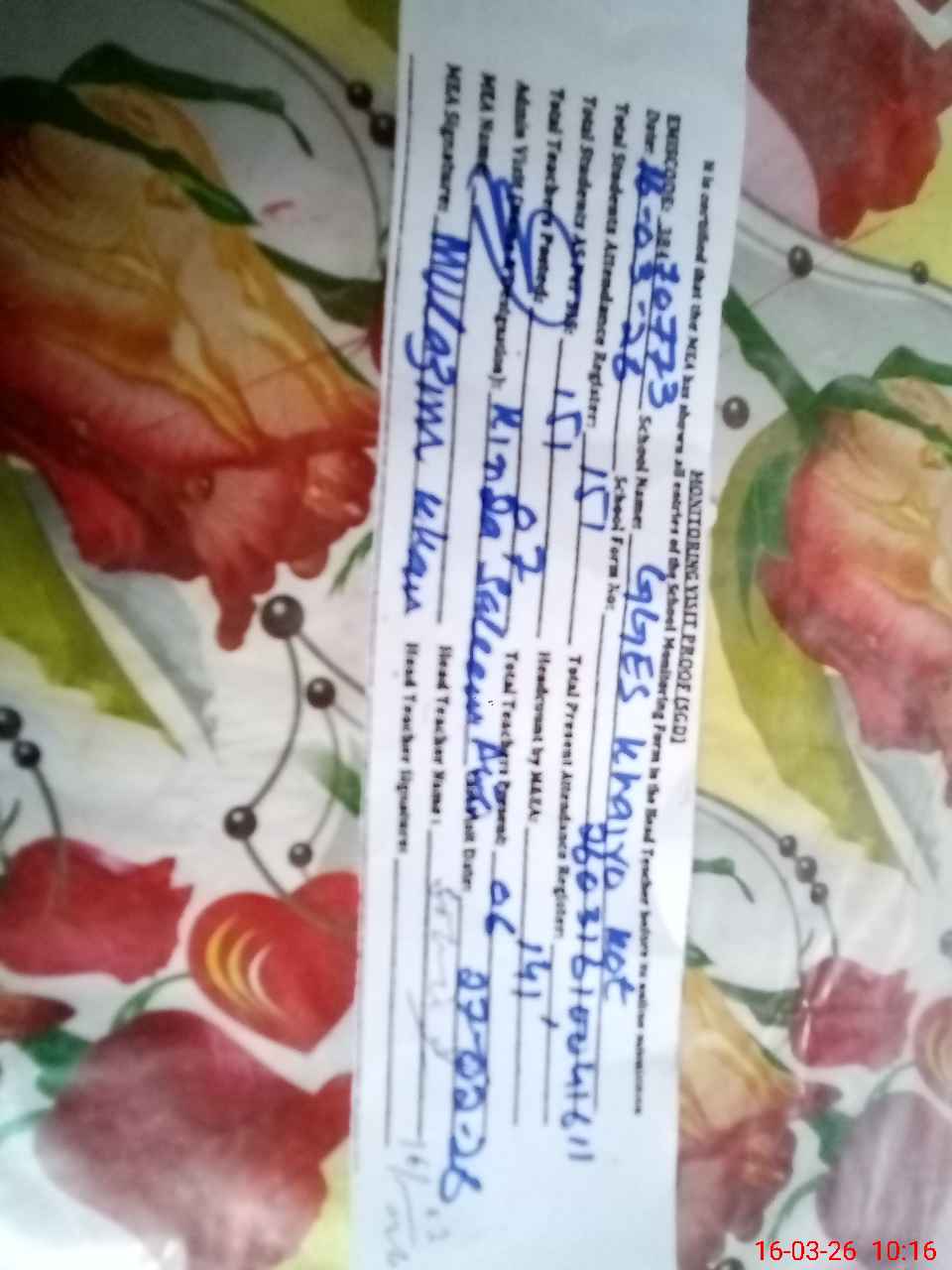 | Attendance Register | Head Teacher | MEA with School | Visit Proof |