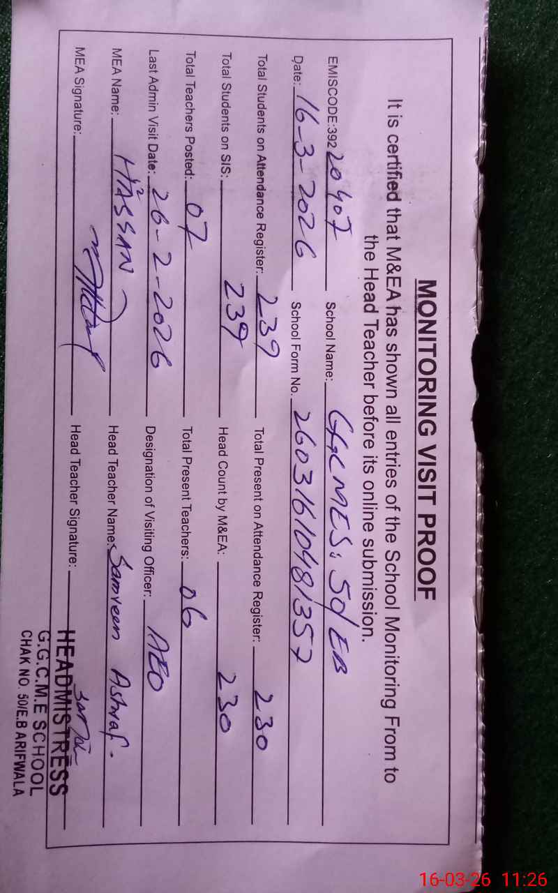 | Certified that this School was Inspected by the Undersigned MEA/DMO Today and the Information Stated Above is as Per Record. | |||||