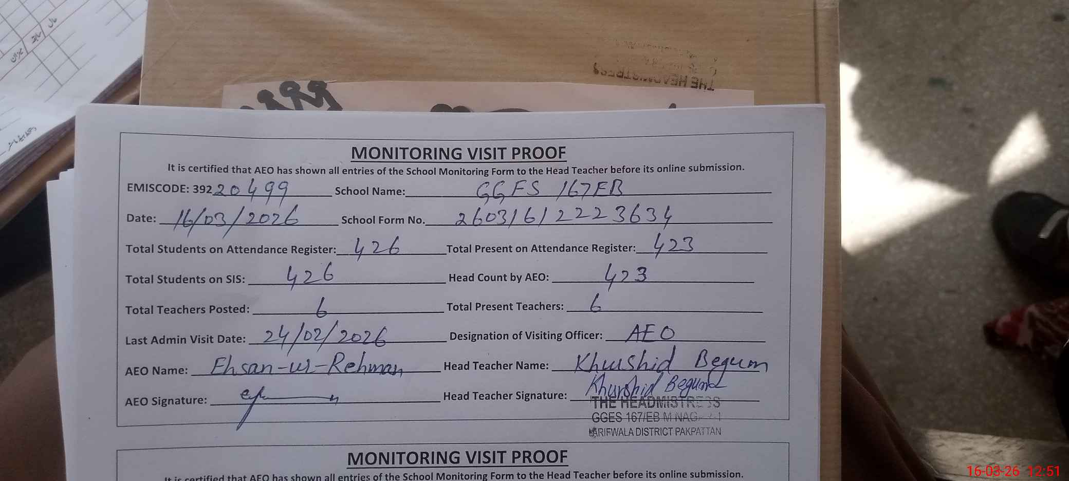 | Attendance Register | Head Teacher | MEA with School | Visit Proof |