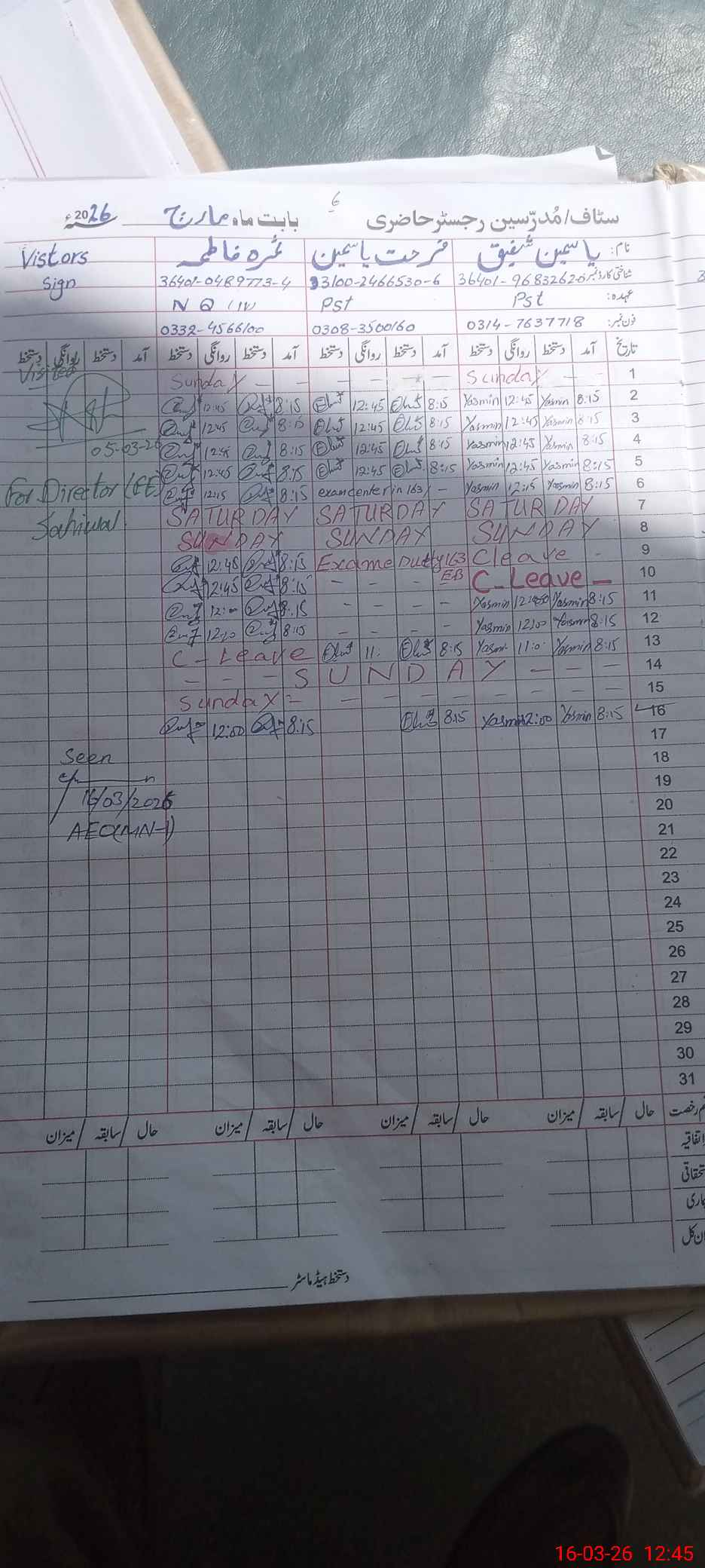 | CNIC | Full Name | Designation | R/C | Absence During Last Calender Month |