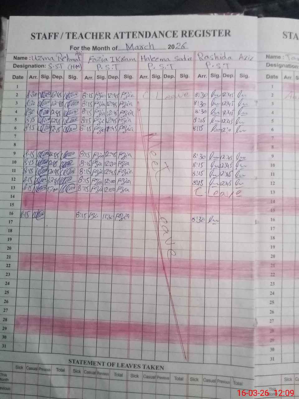 | Leave | Duty | Absent | Maternity | Medical | Ex- Pak |