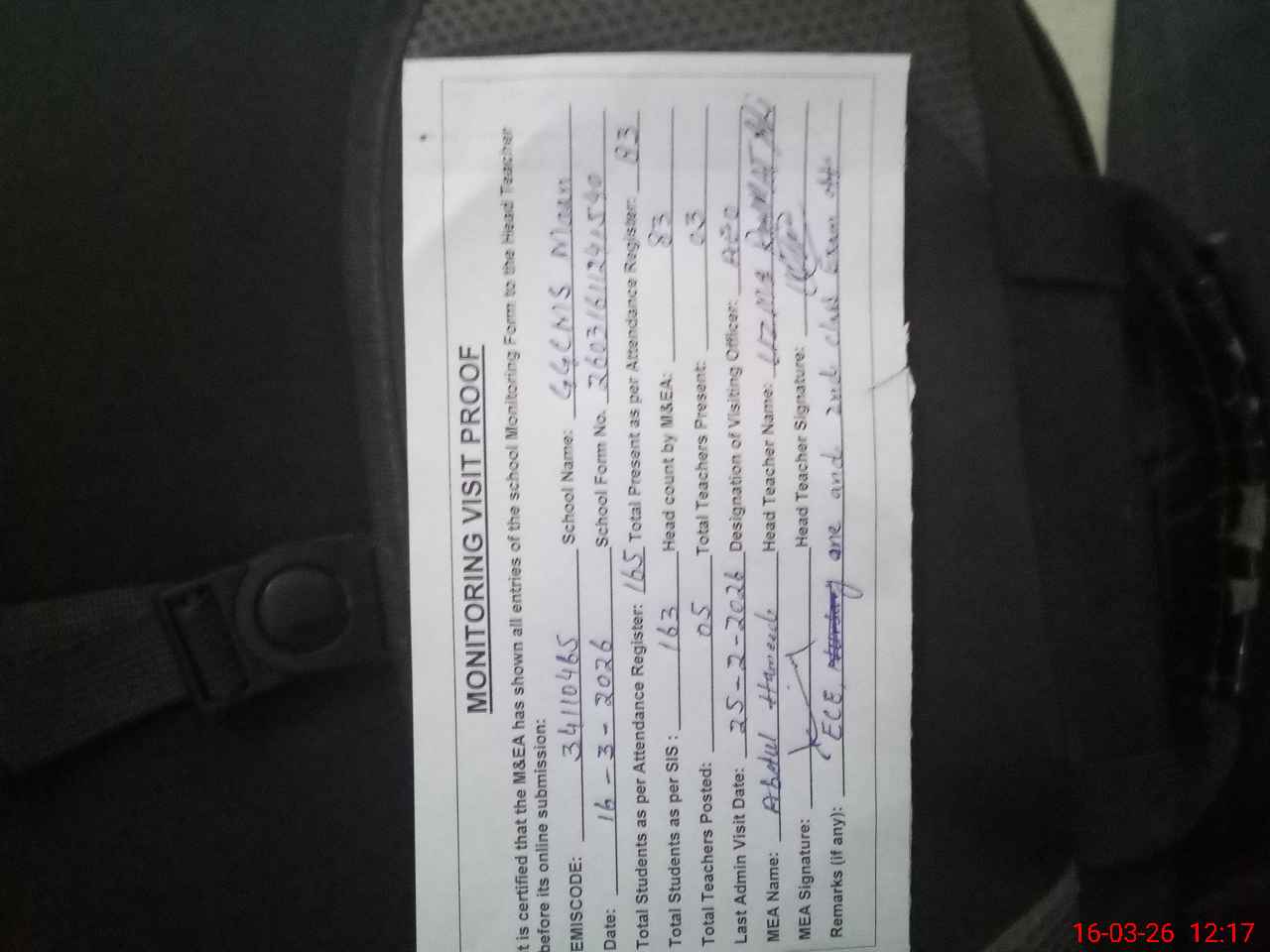 | Attendance Register | Head Teacher | MEA with School | Visit Proof |