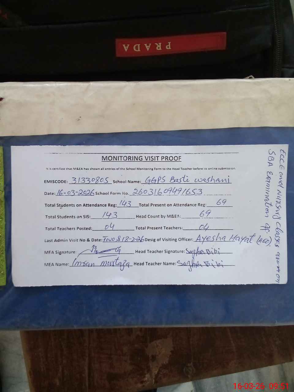 | Attendance Register | Head Teacher | MEA with School | Visit Proof |