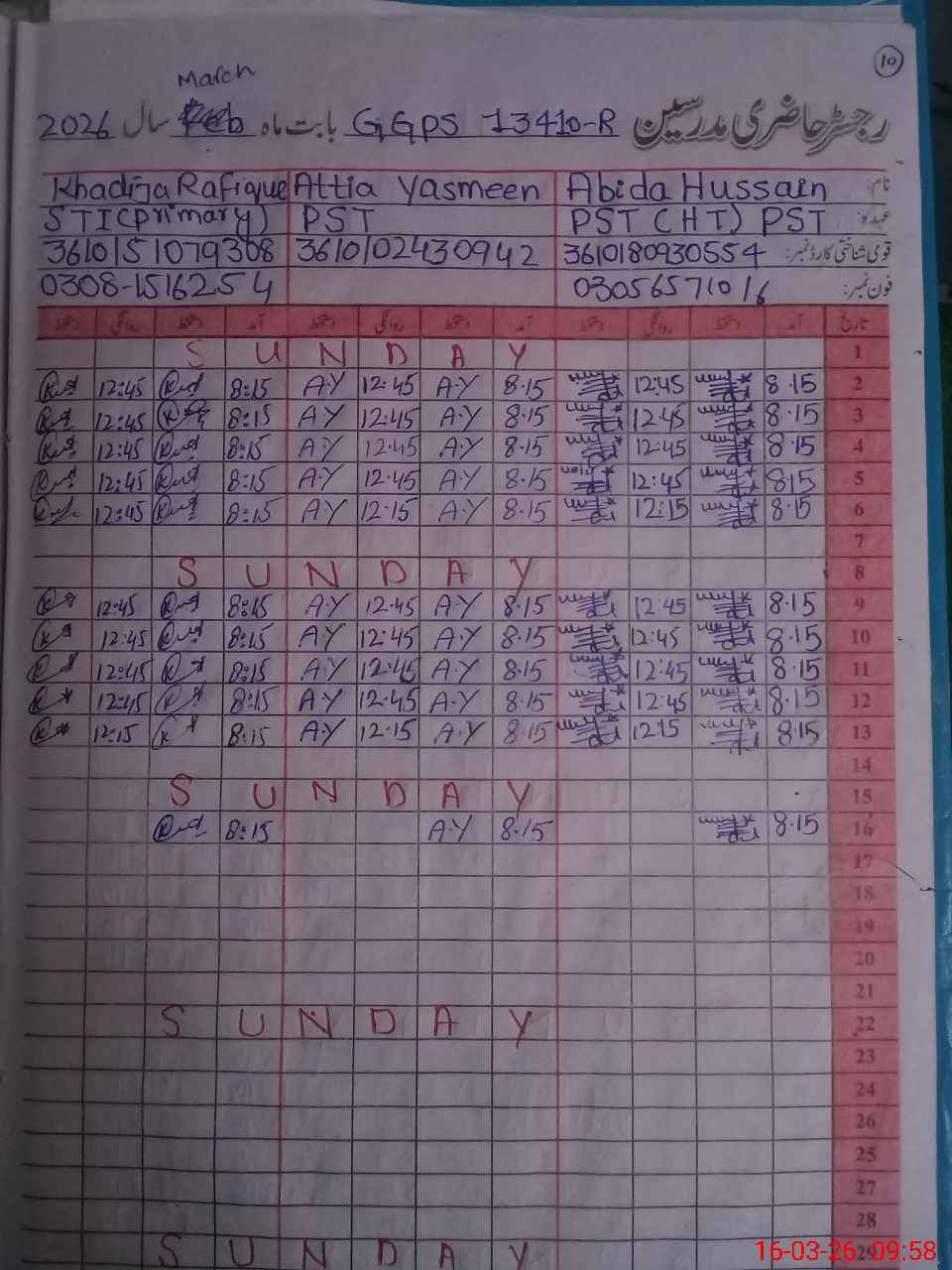 | CNIC | Full Name | Designation | R/C | Absence During Last Calender Month |