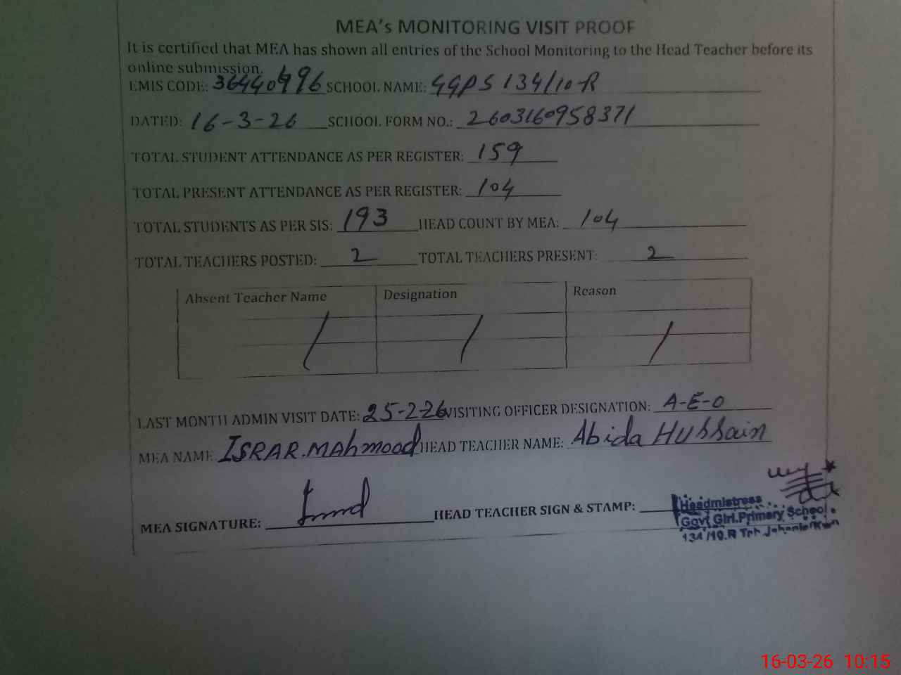 | Attendance Register | Head Teacher | MEA with School | Visit Proof |