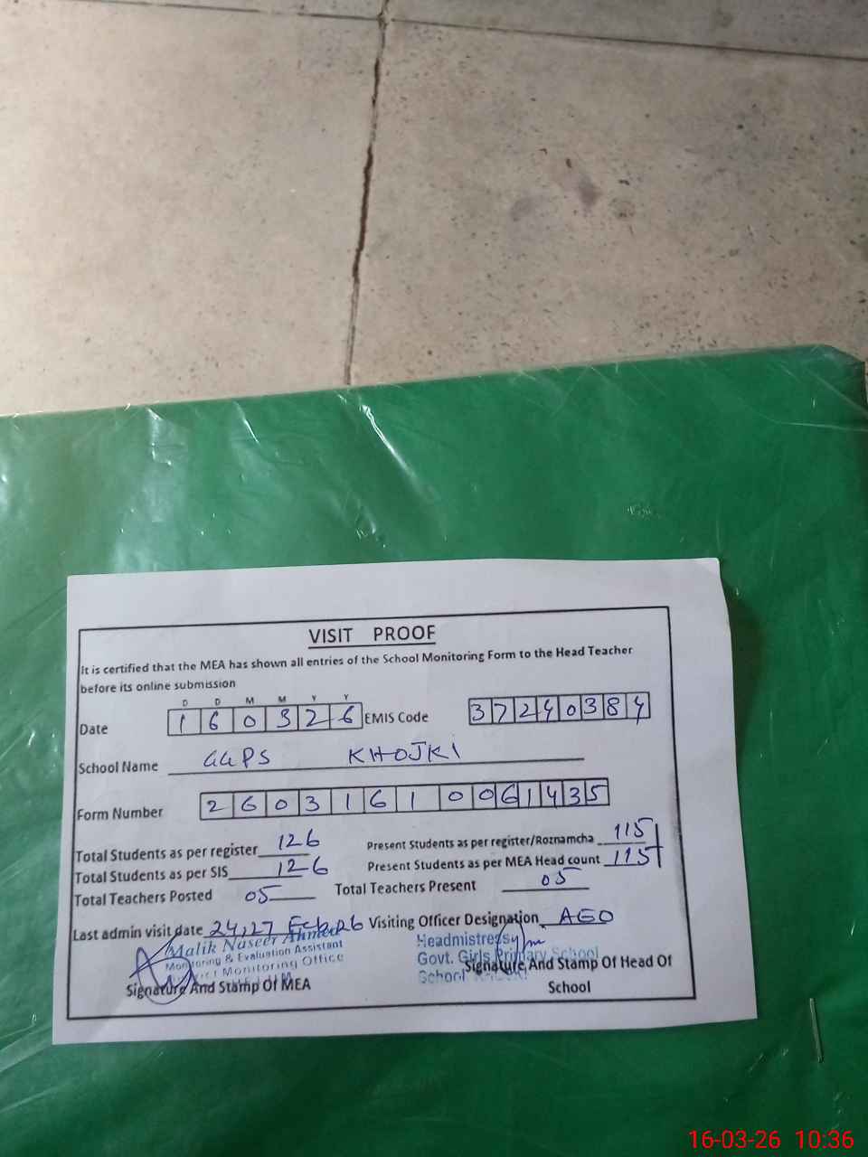 | Attendance Register | Head Teacher | MEA with School | Visit Proof |